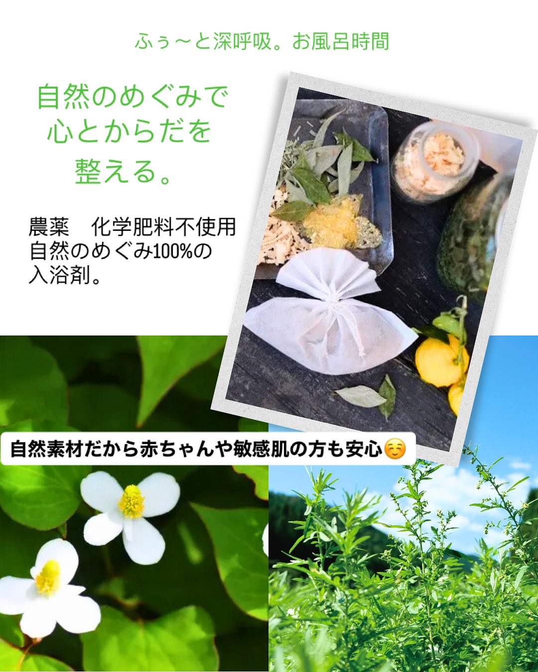 自然そのままの力、日本の植物のパワーで日本の文化、自然の素晴らしさを感じながら身体も心も元気に楽しめる入浴剤☺️
